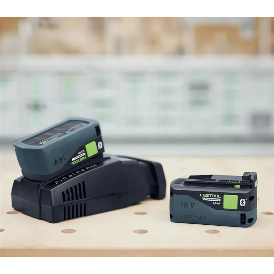 - Dodatkowe funkcje: w połączeniu z funkcją Bluetooth® akumulatora aplikacja Festool zapewnia inteligentne funkcje dodatkowe, jak np. szczegółowe wyświetlanie stanu naładowania oraz innych danych eksploatacyjnych, np. temperatury lub cykli ładowania. W celu szybkiej i łatwej identyfikacji akumulatora o najniższym stanie naładowania miganie wskaźnika LED można aktywować bezpośrednio na akumulatorze. Możliwe są również aktualizacje oprogramowania: po zainstalowaniu najbardziej aktualnej wersji można w każdej chwili korzystać z najnowszych funkcji narzędzi