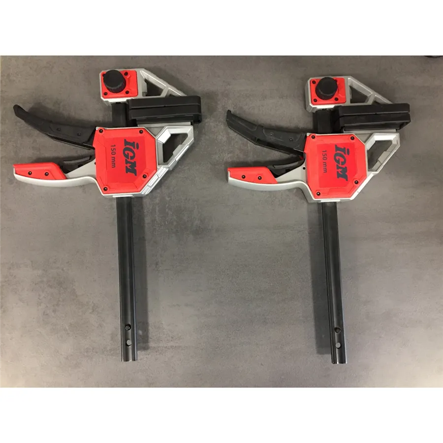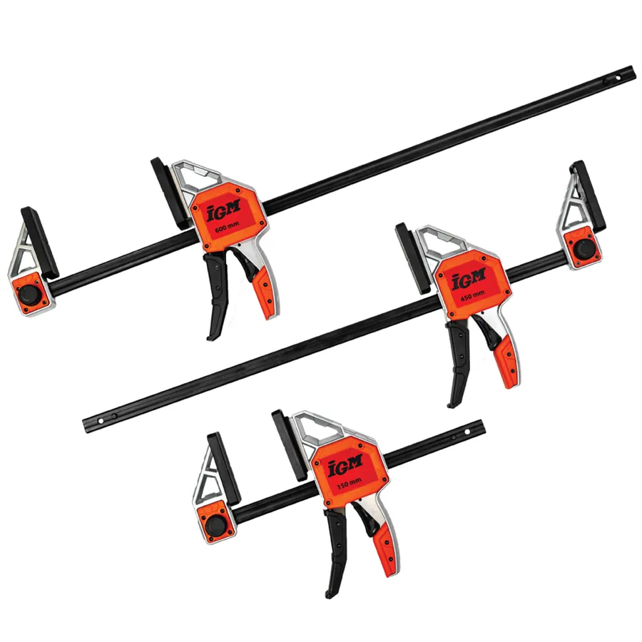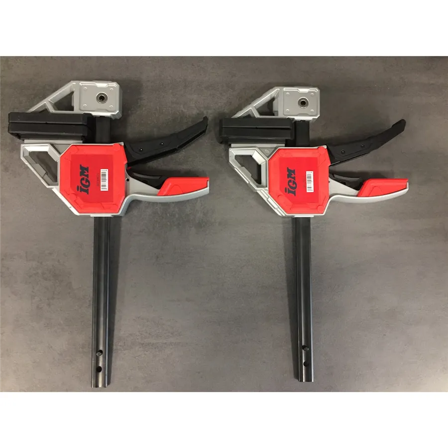 IGM ALU Ścisk szybkomocujący jest przeznaczony dla profesjonalistów i majsterkowiczów, którzy potrzebują w swoim warsztacie solidnego, wytrzymałego ścisku stolarskiego. Szczęki ścisku o głębokości 95 mm wykonane są z aluminium i posiadają duże podkładki 90x36 mm wykonane z miękkiego plastiku. Prowadnica 6x19 mm wykonana jest ze stali węglowej. Ścisk jest wyposażony w dźwignię szybkomocującą i zdejmowaną szczękę do przekształcenia w rozpierak za pomocą pokrętła. Maksymalna siła zacisku do 140 kg. Dostępny w kilku rozmiarach.