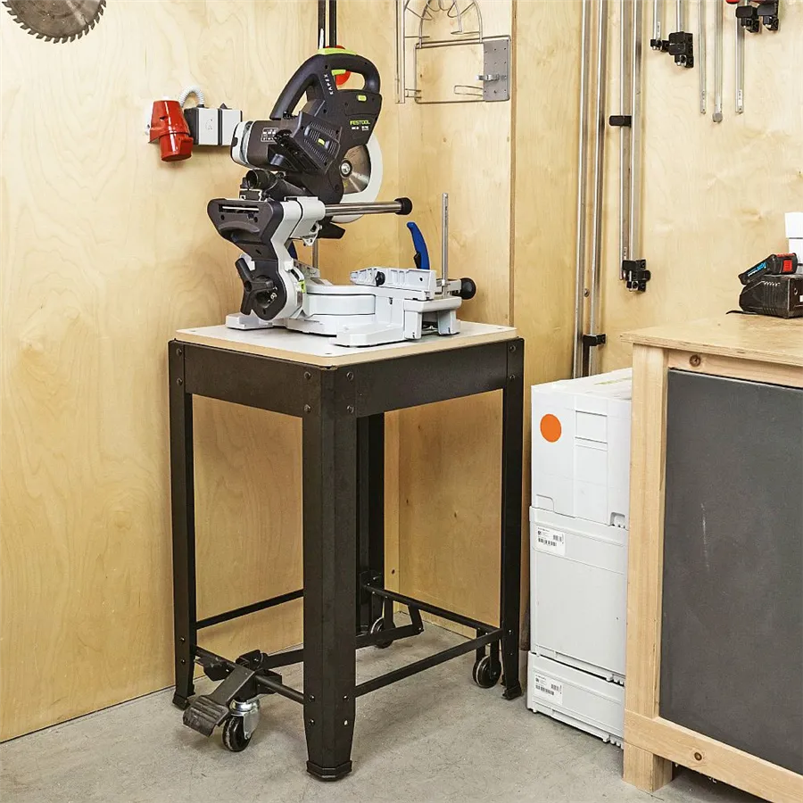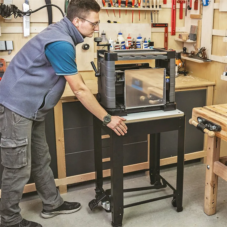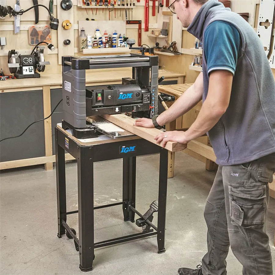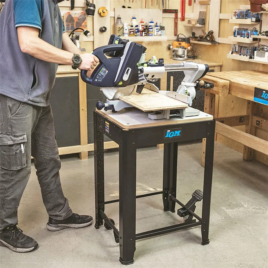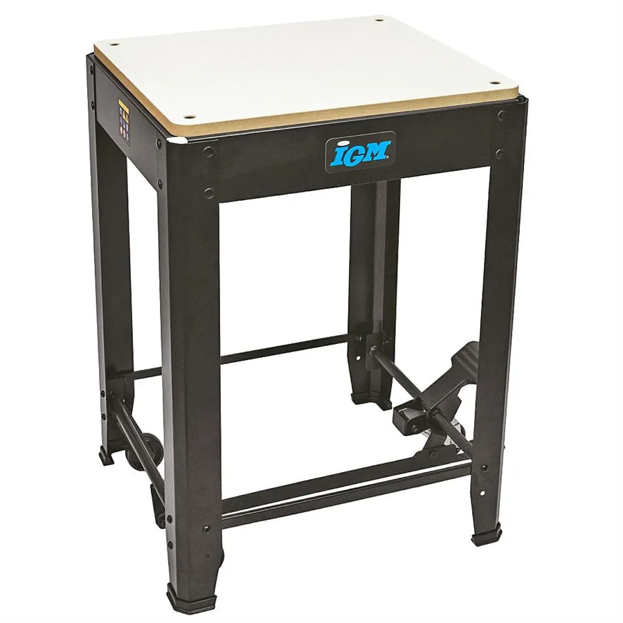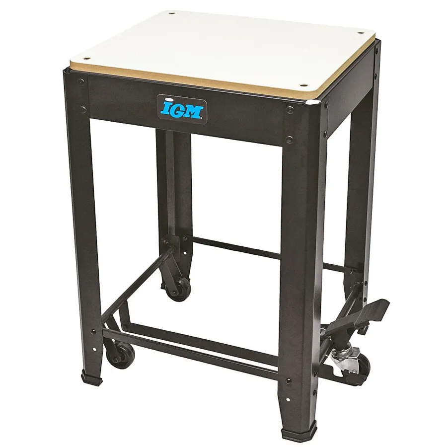 Uniwersalna podstawa jezdna IGM ST1M o nośności do 200 kg stanowi idealne rozwiązanie do stabilnego, bezpiecznego i jednocześnie mobilnego ustawienia maszyn stołowych w warsztacie. Nadaje się do frezarek grubościówek, pił taśmowych i ukośnych, wiertarek stołowych i szlifierek oraz innych urządzeń warsztatowych o podobnych rozmiarach. Dzięki płaskiej powierzchni roboczej o wymiarach 570 × 500 mm stojak można łatwo dostosować do większości popularnych maszyn stołowych. Aby zamocować konkretną maszynę, należy wywiercić otwory w płycie MDF.