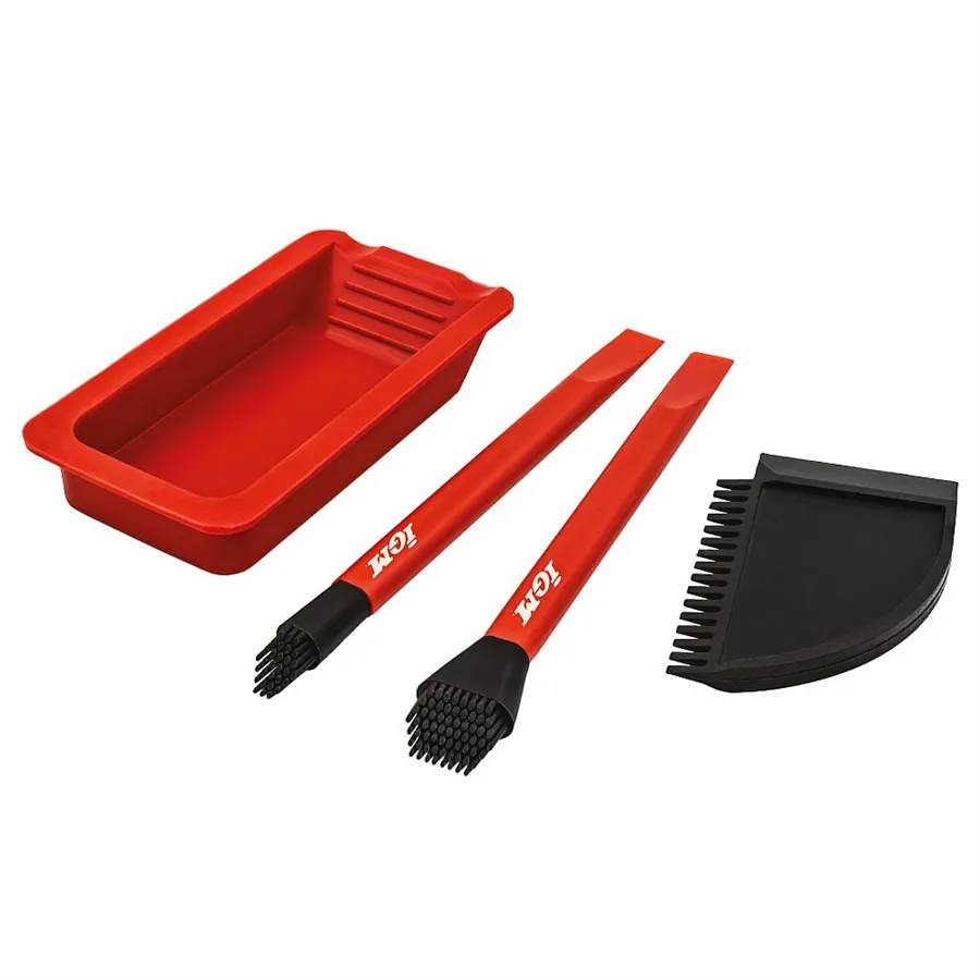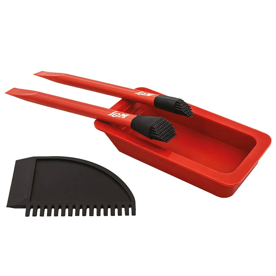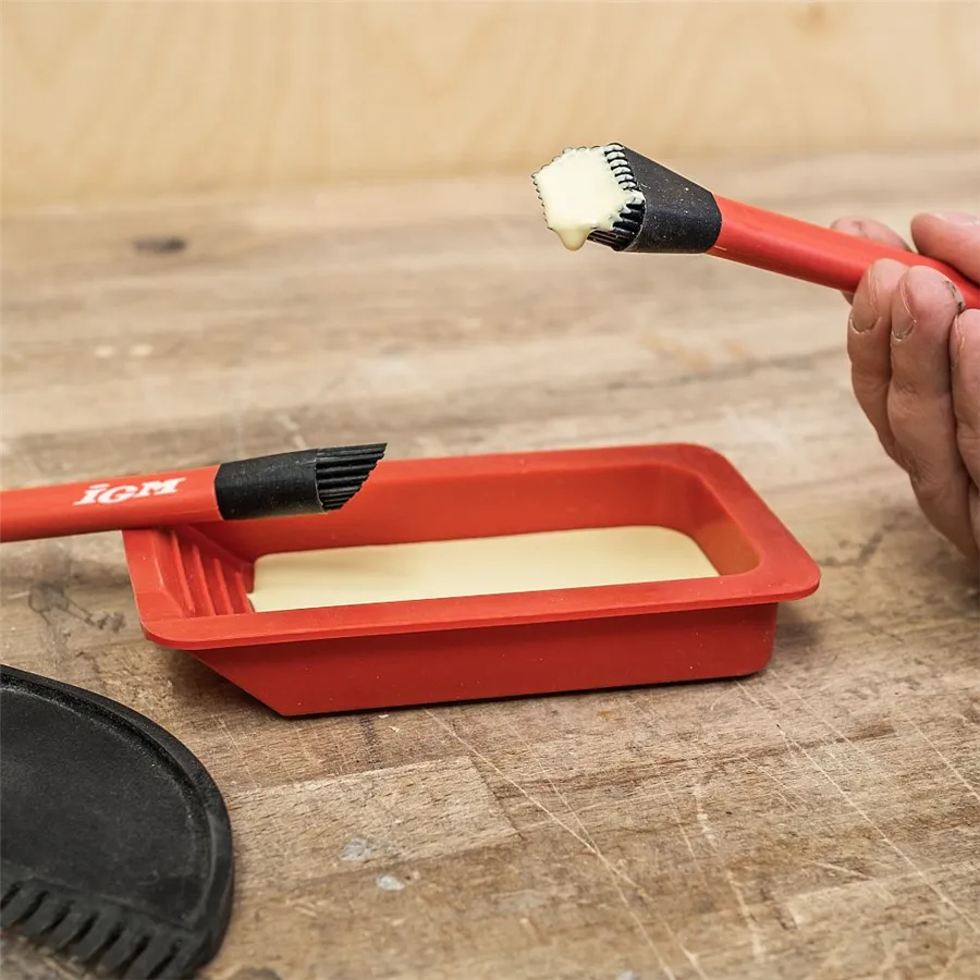 Silikonowy zestaw do klejenia IGM z dwoma pędzelkami o szerokości 13 i 24 mm, silikonową ściągaczką i tacką ułatwia nakładanie kleju na elementy. Miękkie silikonowe włosie na nakładce równomiernie rozprowadza klej na wąskich i szerszych powierzchniach.