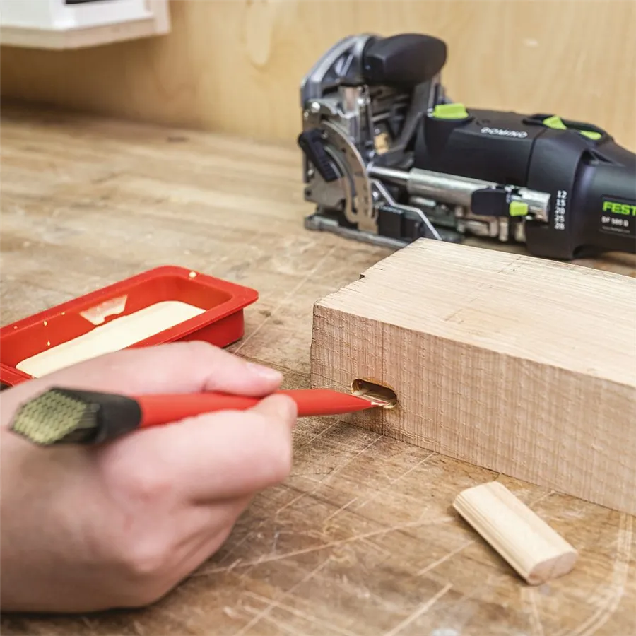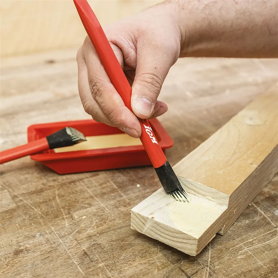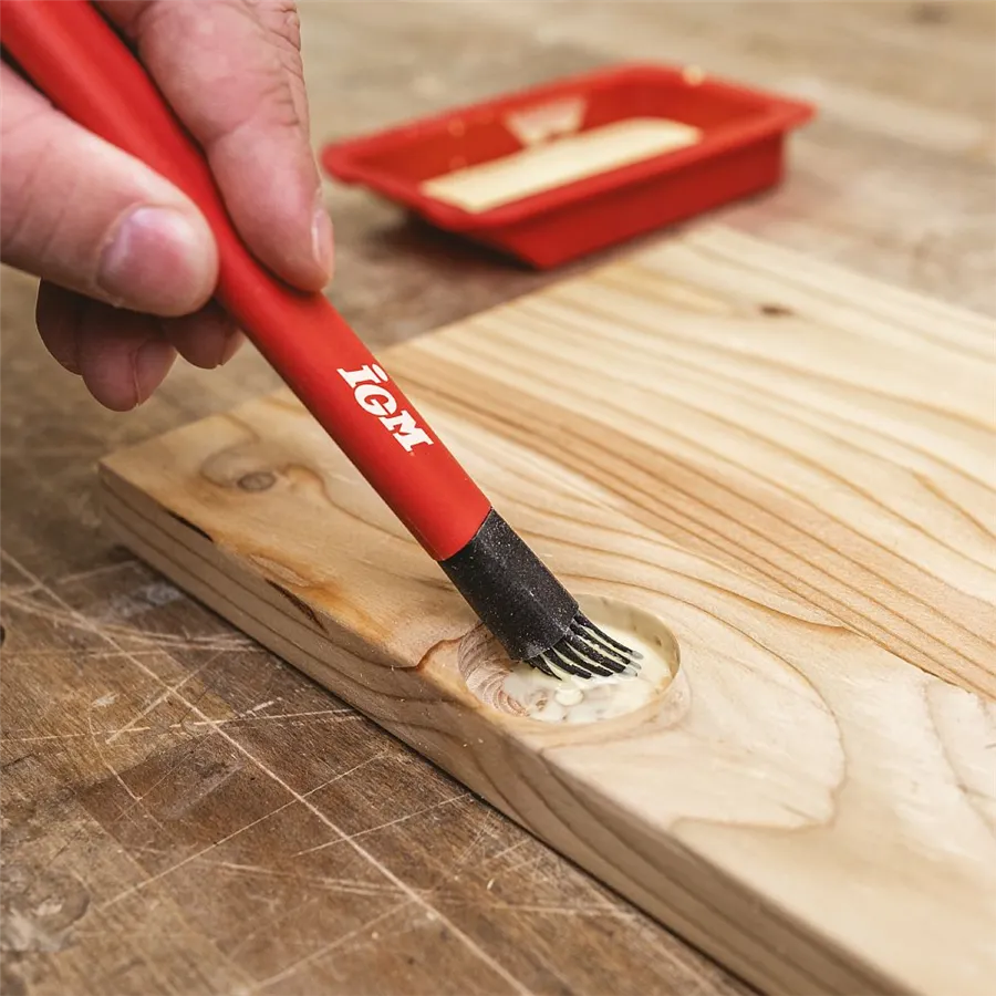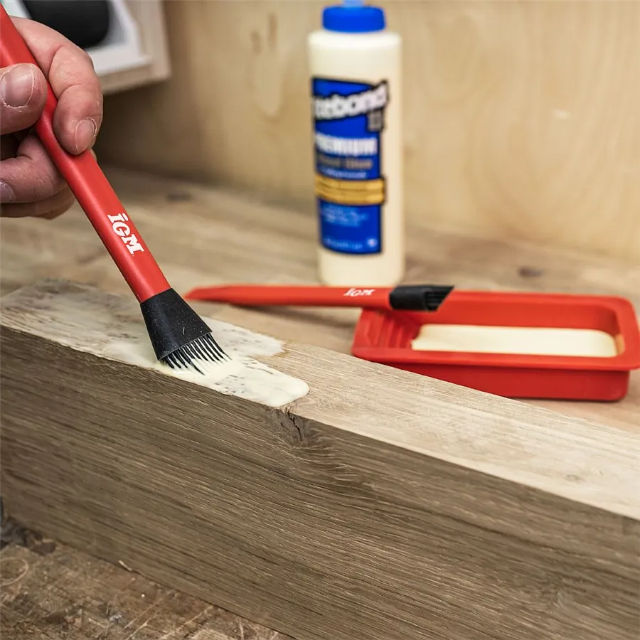 Silikonowe pędzelki do nakładania kleju na drewno. Dwa rozmiary pędzelków wraz z silikonową ściągaczką i tacką. Łatwe do czyszczenia.