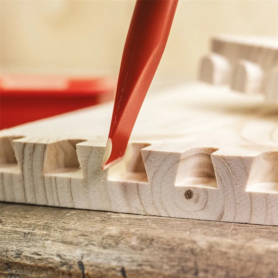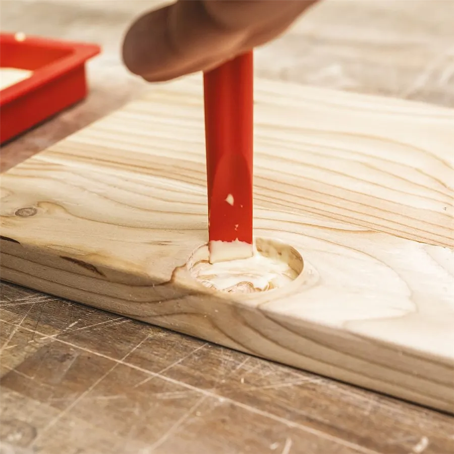 Spłaszczona plastikowa końcówka uchwytu jest lekko elastyczna, co zapewnia wygodną aplikację. Dzięki długości 40 mm łatwo rozprowadzić klej nawet w głębokich rowkach lub połączeniach na jaskółczy ogon.
