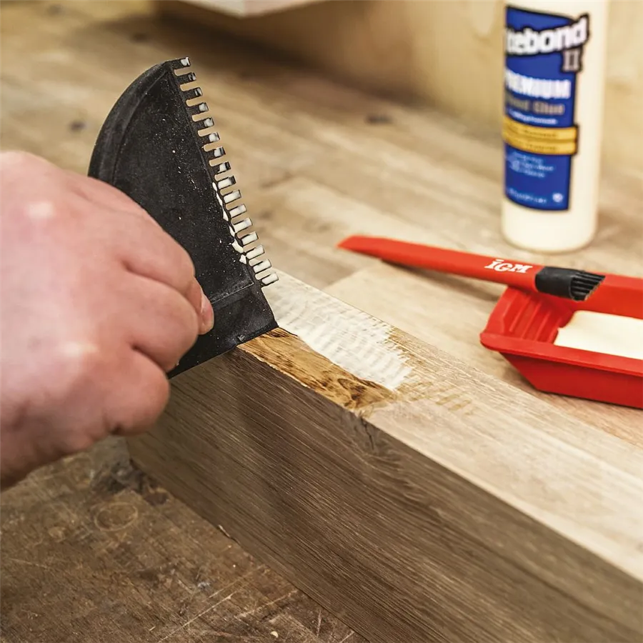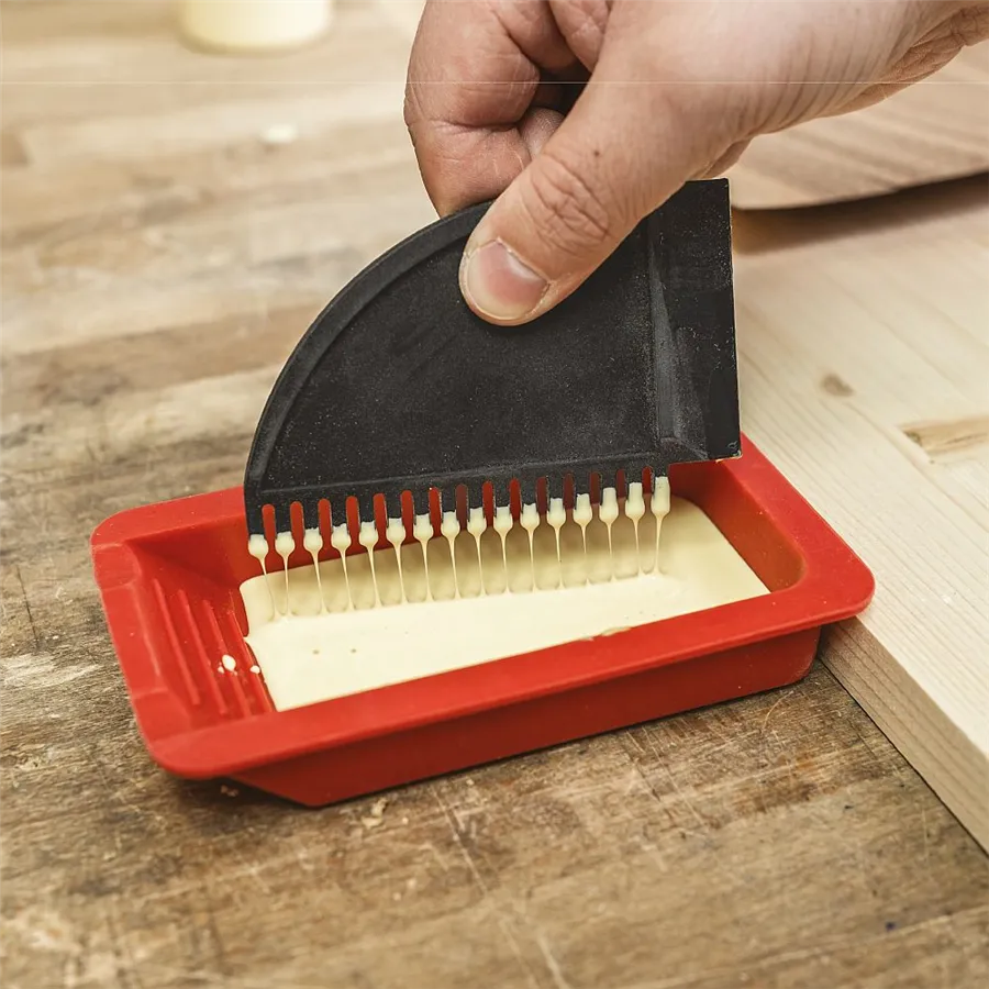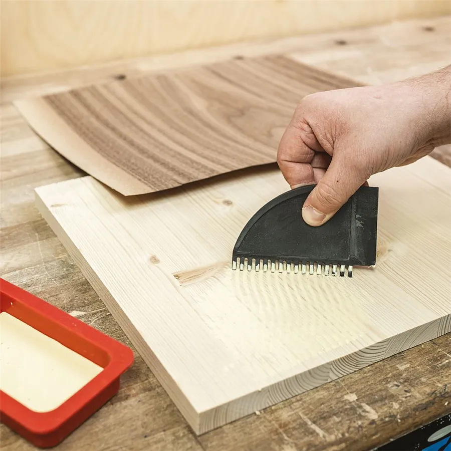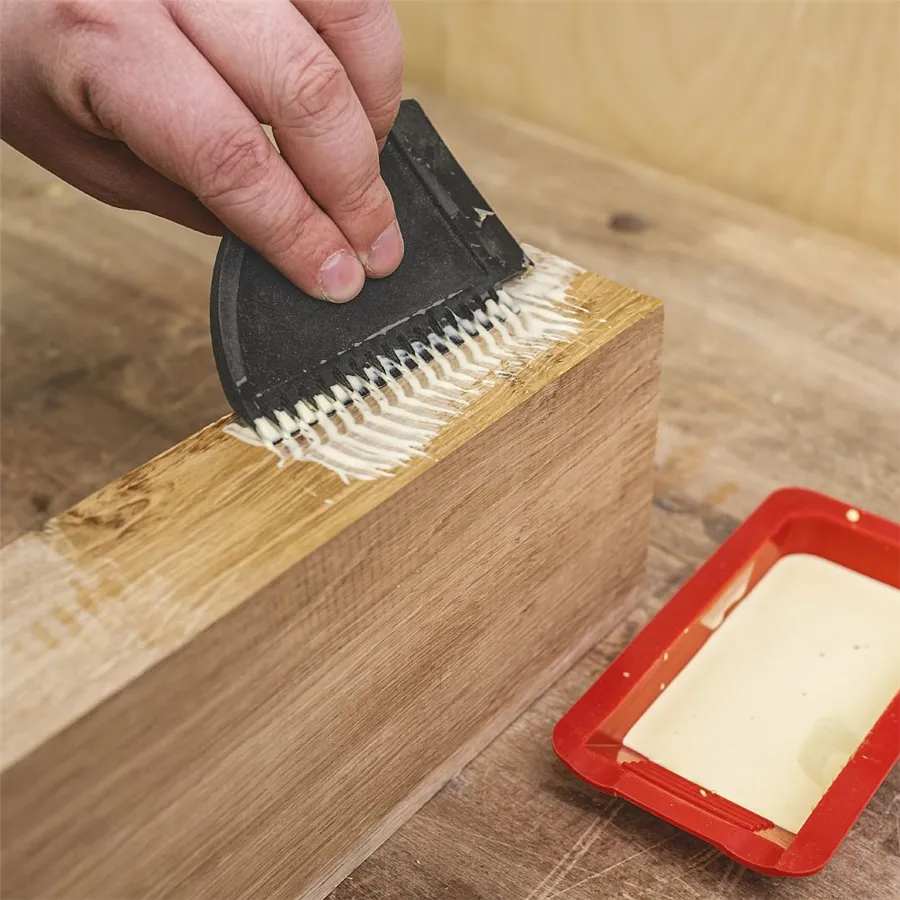 Do większych powierzchni można również użyć ściągaczki silikonowej w formie grzebienia do nakładania kleju w sposób ciągły na całej powierzchni materiału lub, na przykład, na płaskie czopy. Płaska, gładka krawędź silikonowej ściągaczki służy do precyzyjnego usuwania nadmiaru kleju z miejsc, w których nie powinien się on znajdować.