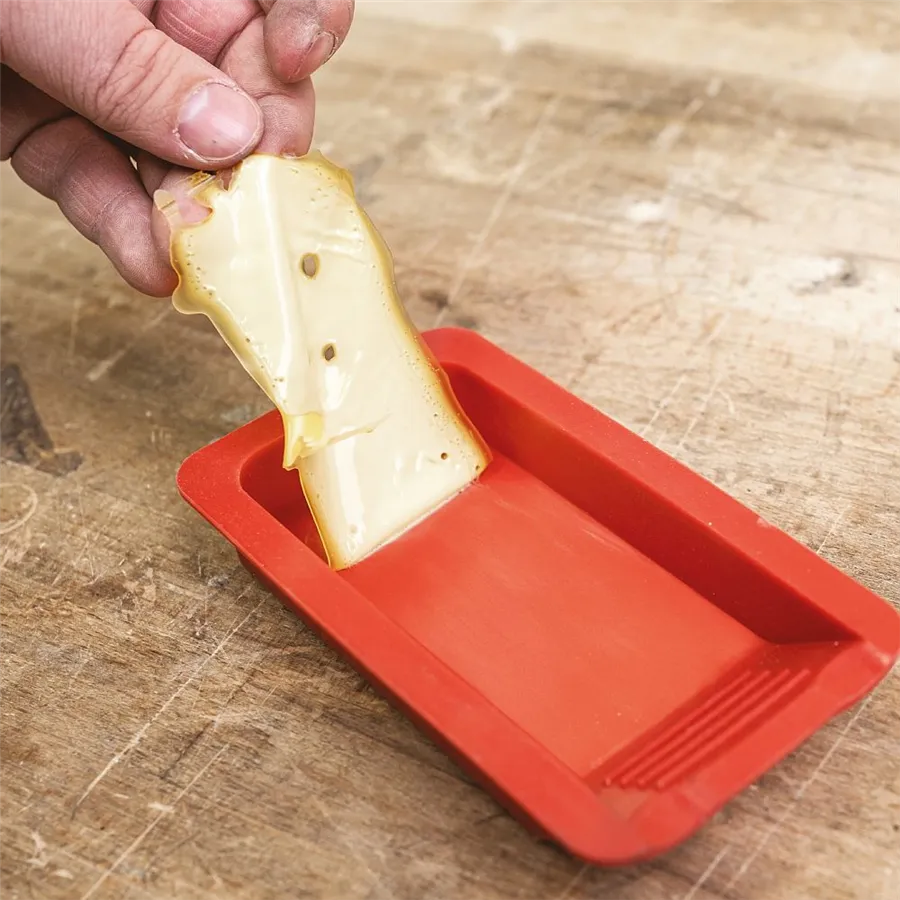 Ściągaczka, tacka i nasadki na pędzelki są wykonane z silikonu, co ułatwia czyszczenie. Po zakończeniu pracy nadmiar kleju należy wlać z powrotem do pojemnika, korzystając z wgłębień z boku tacki. Można również użyć tych wgłębień jako podpórki pod pędzel, aby uniknąć zabrudzenia powierzchni roboczej podczas pracy. Pozostałości kleju na pędzlach i tacce należy pozostawić do wyschnięcia, a po zakończeniu pracy po prostu zdjąć lub umyć wszystko letnią wodą.