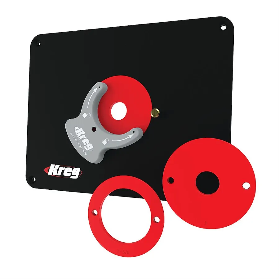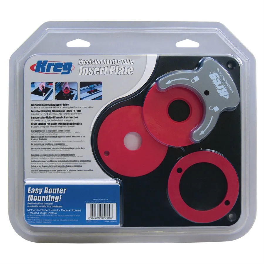 Płyta jest wyposażona w pierścienie redukcyjne Level-Loc, które umożliwiają łatwą zmianę rozmiaru otworu wokół freza. Pierścienie redukcyjne montuje się do płytki za pomocą dołączonego klucza oczkowego.